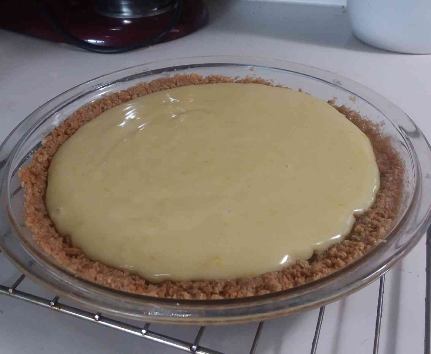 Crush the graham crackers, add the sugar and melted butter. Press into pie pan and bake at 375 degrees for 7 minutes or until slightly toasted in appearance. Cool for 30 minutes before adding the filling.