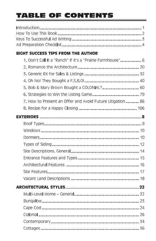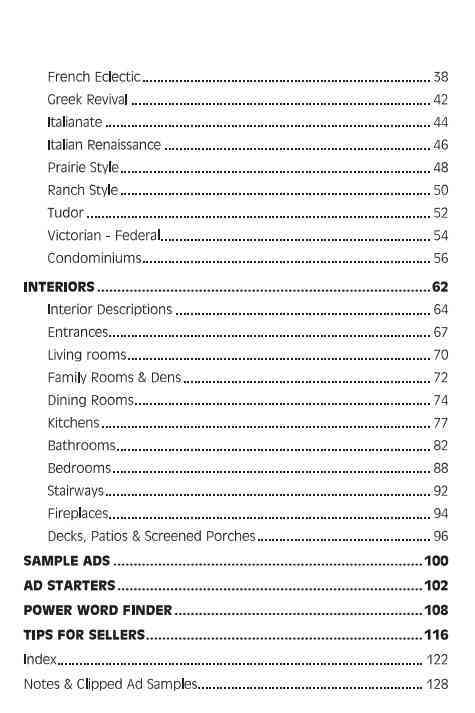 Word Marketing explains what to look for and how to identify elements in your listings, and help you write powerful ads to attract just the right buyers. Here's a snip from the table of contents.
